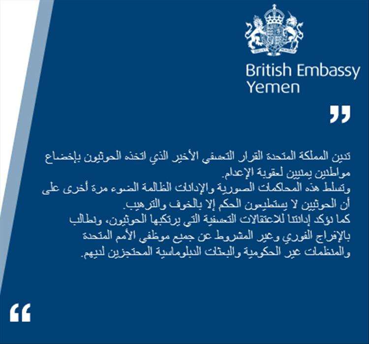 أدانت السفارة البريطانية في اليمن القرار التعسفي الأخير الذي اتخذته جماعة الحوثي بإخضاع مواطنين يمنيين لعقوبة الإعدام، معتبرة أن هذه الأحكام تأتي ضمن محاكمات صورية وإدانات ظالمة تعكس لجوء الحوثيين إلى الترهيب بدلًا من العدالة.