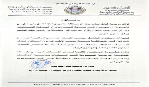 ودعت مرجعية قبائل حضرموت قيادة التحالف العربي، وفي مقدمتها المملكة العربية السعودية، إلى اتخاذ موقف سريع إزاء ما وصفته بـ“التدهور الحاصل”، مؤكدة أن تدخل أطراف التحالف بات ضرورة ملحّة للحفاظ على أمن حضرموت واستقرارها ومنع انزلاقها إلى صراع داخلي.