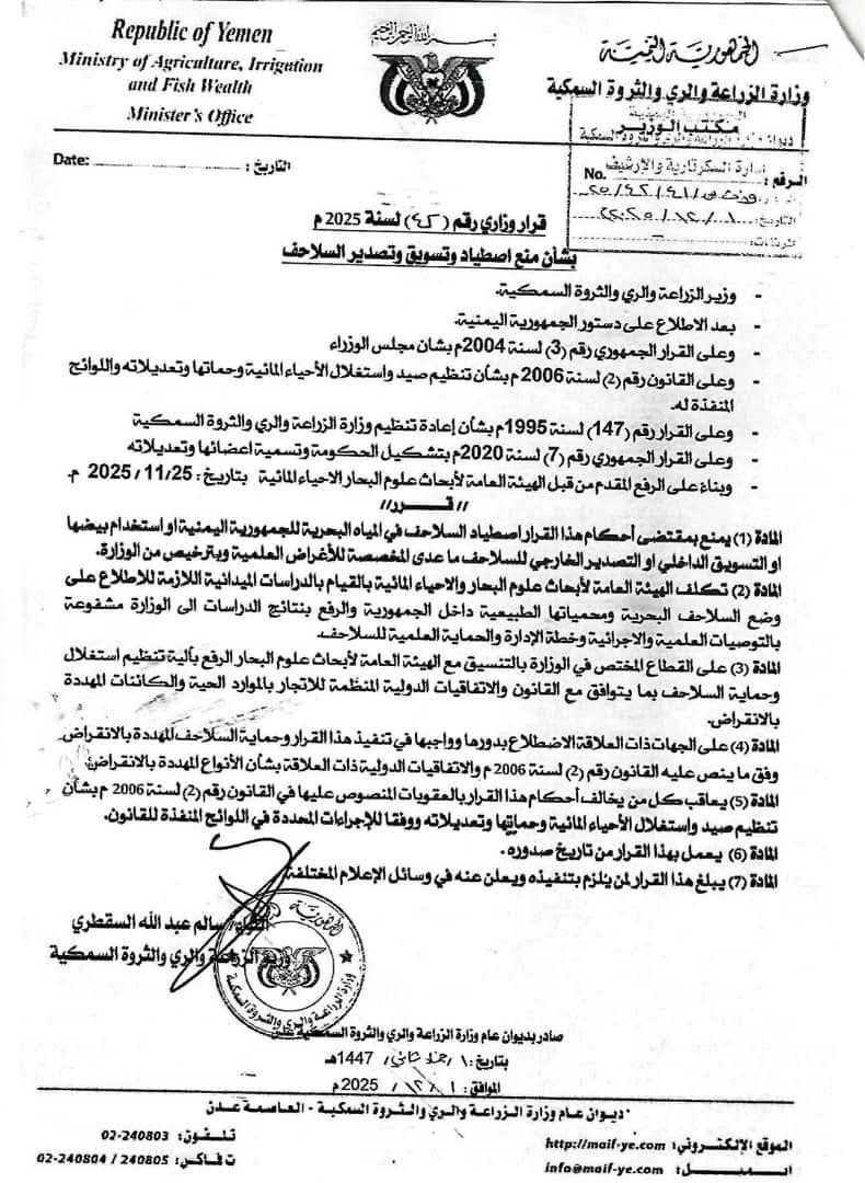 ويأتي هذا القرار في إطار جهود الوزارة لحماية هذا المورد البحري الهام، بعد تنامي مؤشرات استنزافه خلال الأعوام الماضية، وحرصاً على الحفاظ على التوازن البيئي والثروة البحرية.