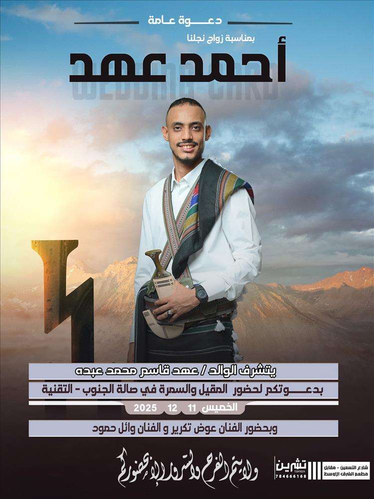 بقلوب يملؤها الفرح والسرور، يتشرّف الوالد عهد قاسم بدعوتكم لحضور حفل المقيل والسمرة الخاص بابنه الشاب أحمد، وذلك يوم الخميس الموافق 11 / 12 / 2025.