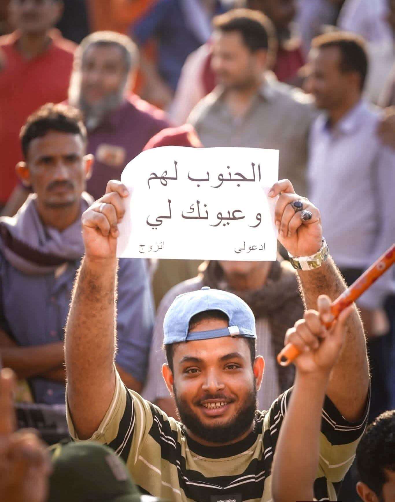 رفع شاب مشارك باعتصام الانتقالي بساحة العروض لافتة صغيرة عبارة عن خزل