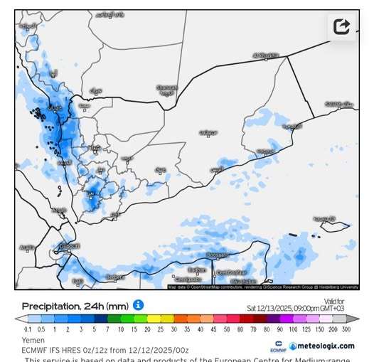 من المتوقع استمرار تشكّل السحب والغيوم على نطاق واسع، تشمل المناطق الجنوبية والغربية من اليمن، ممتدة من صعدة شمالًا حتى لحج جنوبًا.