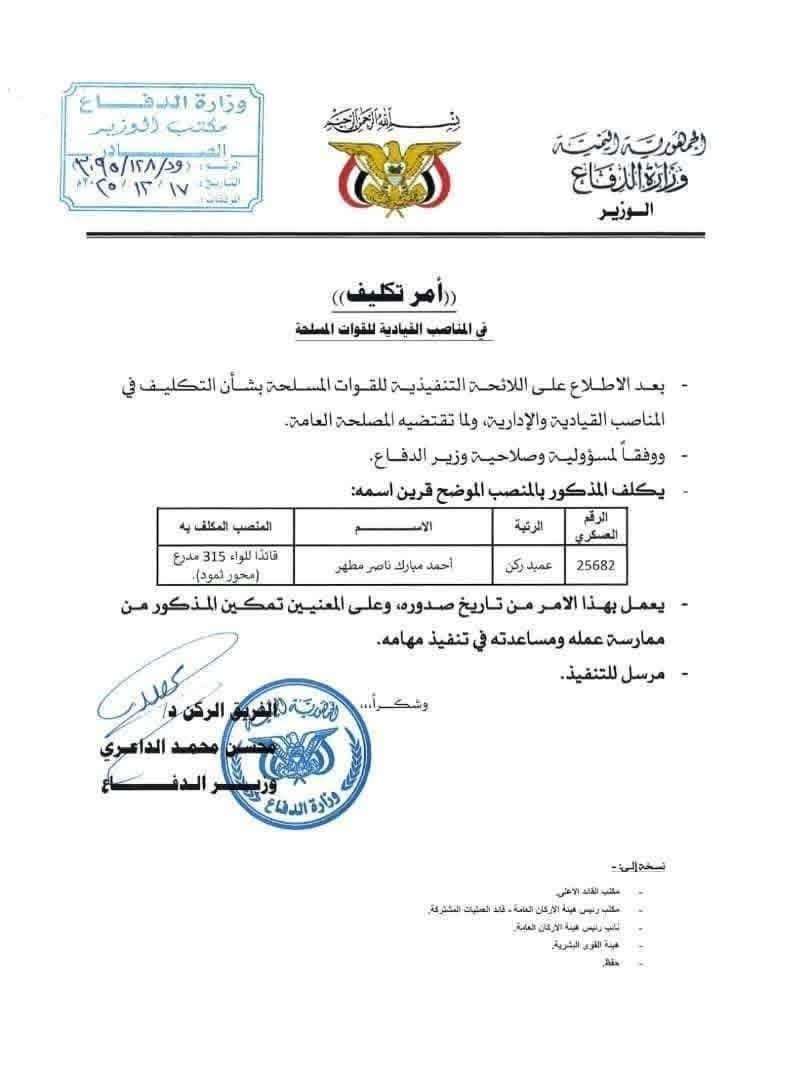 واصدر وزير الدفاع قرار بتكليف قايد للواء ٣١٥ محور ثمود .