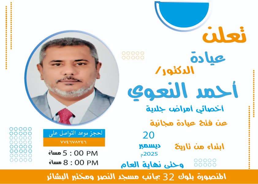 يعتزم الدكتور أحمد النعوي أخصائي أمراض جلدية، إقامة عيادة مجانية لأمراض الجلد في مدينة عدن.