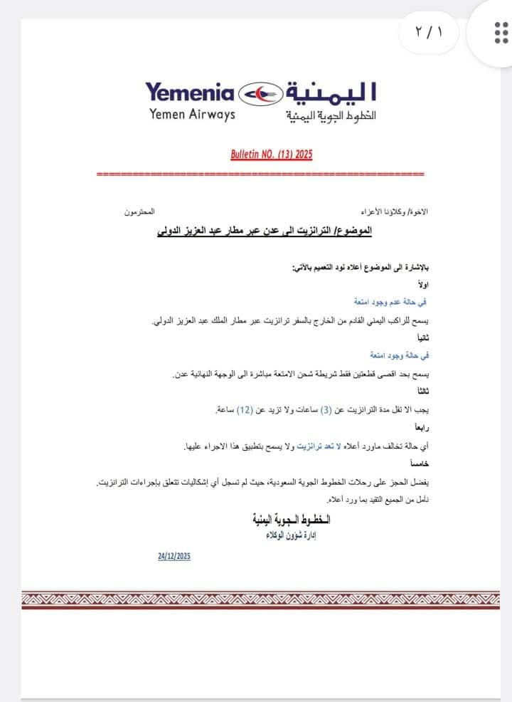 أصدرت إدارة شؤون الوكلاء بالخطوط الجوية اليمنية، اليوم الأربعاء، تعميماً جديداً (رقم 13 لعام 2025) يتضمن حزمة من الضوابط المنظمة للمسافرين اليمنيين القادمين من الخارج بنظام "الترانزيت" عبر مطار الملك عبد العزيز الدولي بجدة وصولاً إلى مطار عدن الدولي.