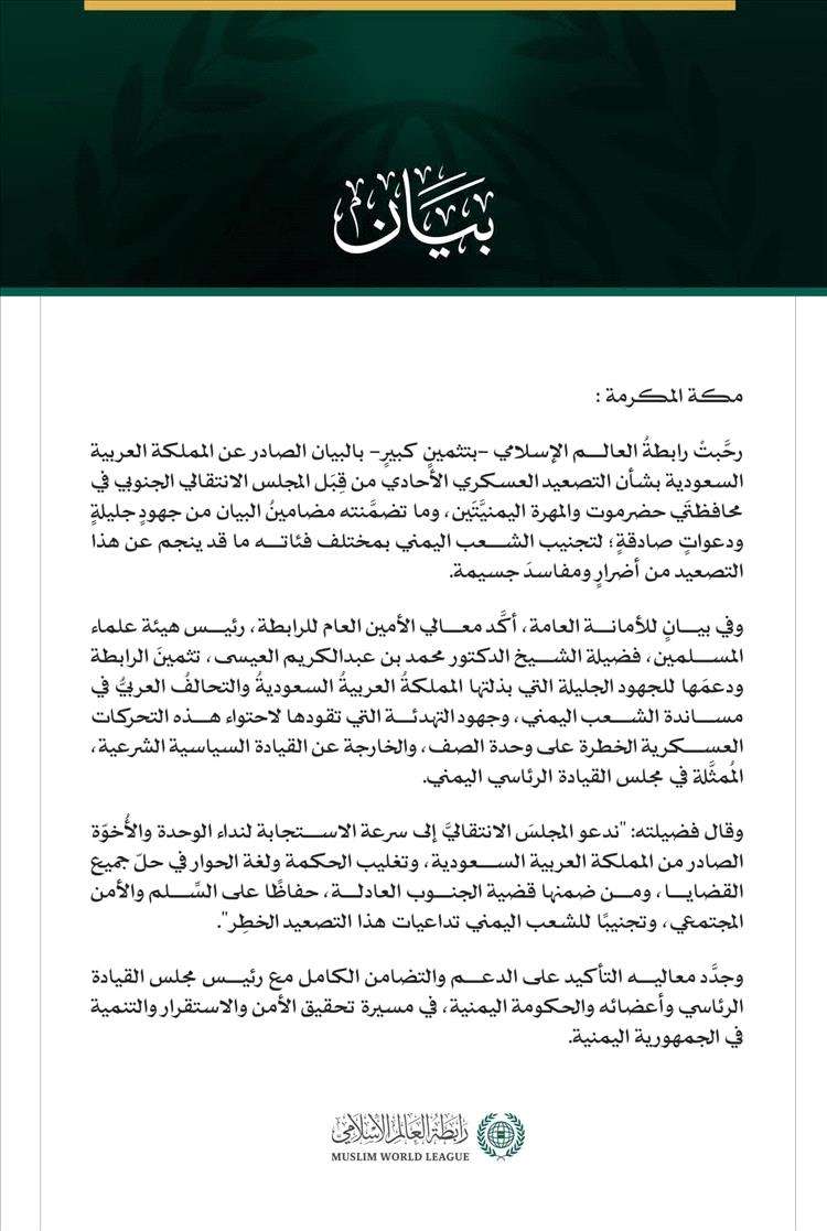 ​أعربت رابطة العالم الإسلامي عن ترحيبها وتثمينها الكبير للبيان الصادر عن المملكة العربية السعودية بشأن التصعيد العسكري الأحادي من قبل المجلس الانتقالي الجنوبي في محافظتي حضرموت والمهرة اليمنيتين. وأكدت الرابطة دعمها الكامل لما تضمنه البيان من جهود جليلة ودعوات صادقة تهدف إلى تجنيب الشعب اليمني بمختلف فئاته الأضرار والمفاسد الجسيمة الناتجة عن هذا التصعيد.