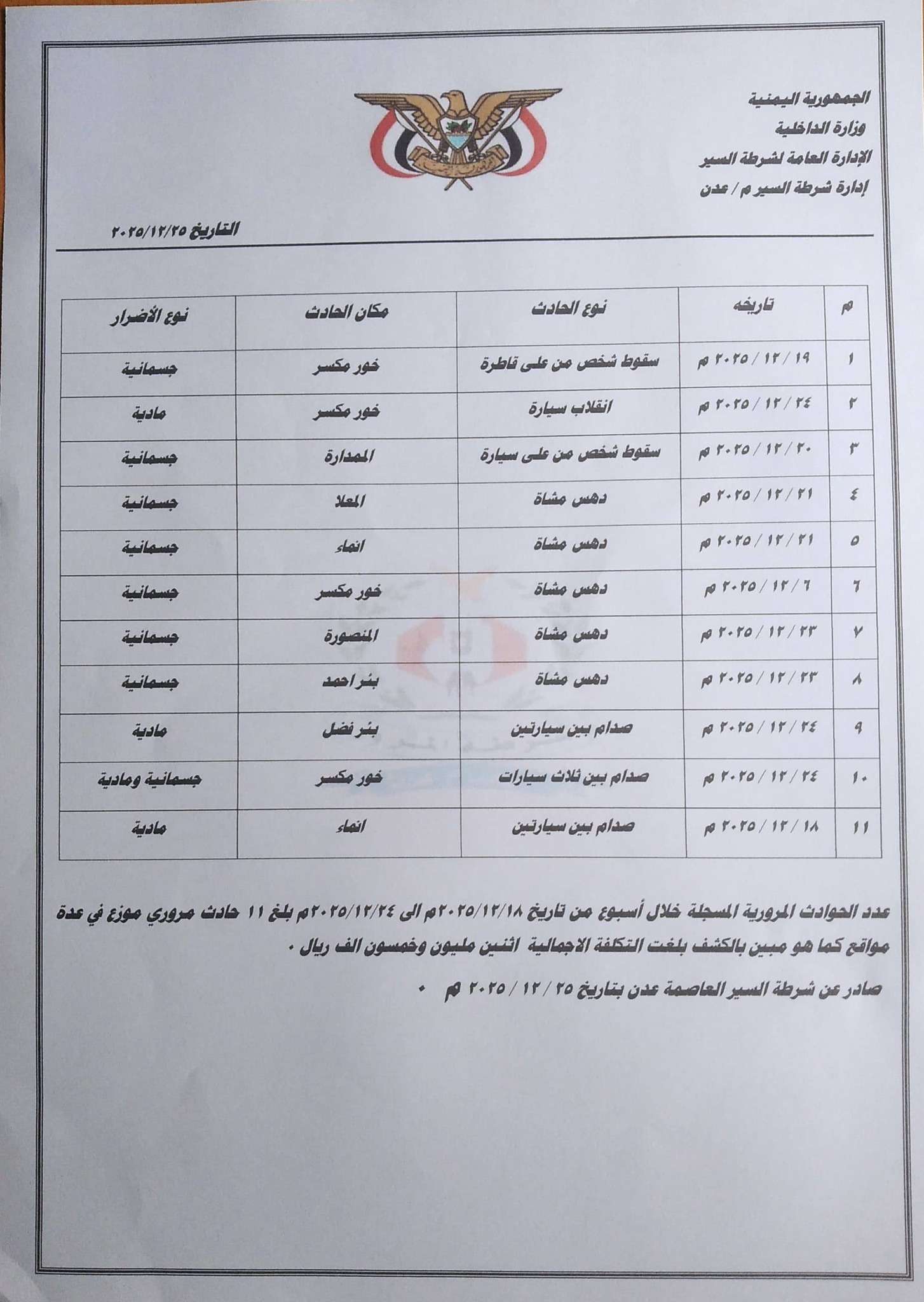 أصدرت شرطة السير بمحافظة عدن تقريرها الأسبوعي للمخالفات والحوادث المرورية المسجلة خلال الفترة من 18 إلى 24 ديسمبر 2025م في عموم مديريات العاصمة.
