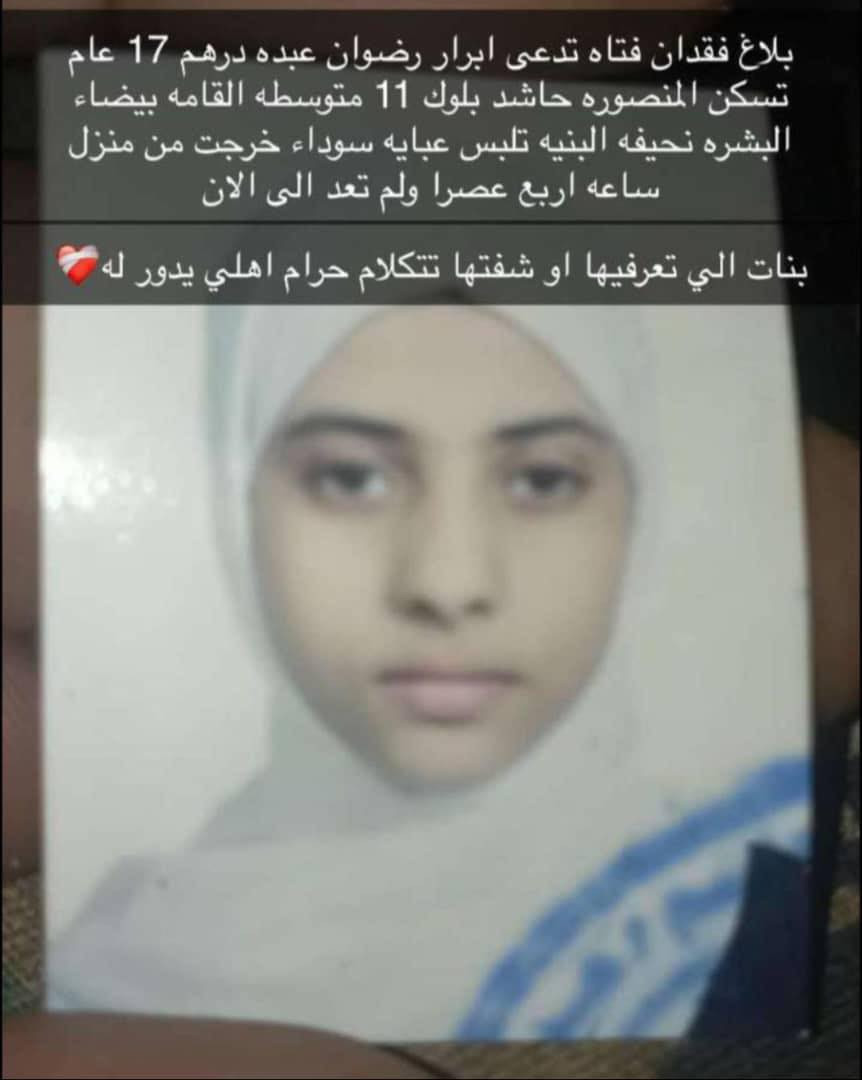 أعلنت أسرة الفتاة إبرار رضوان عبده درهم (17 عامًا) عن اختفائها منذ عصر اليوم في مدينة عدن، عقب خروجها من منزلها الواقع في مديرية المنصورة — بلوك 11، بالقرب من متوسطة القامة — دون أن تعود حتى الآن.