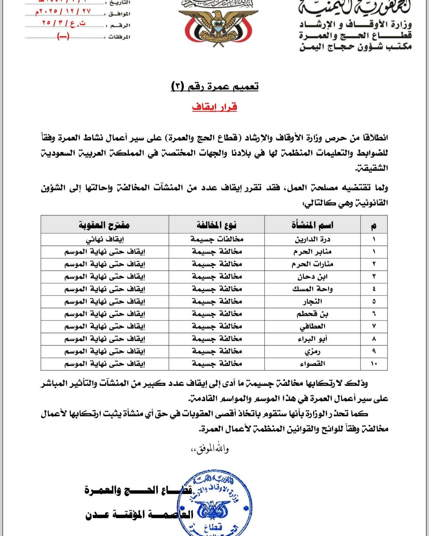 قرار صارم من عدن بشأن إيقاف هؤلاء السبت ٢٧ ديسمبر ٢٠٢٥ الساعة ٠٩:٤٤ مساءً حفظ الصورة كريتر سكاي: خاص أصدرت وزارة الأوقاف بعدن قرار صارم بشأن إيقاف عدد من المنشآت المخالفة وإحالتها إلى الشؤون القانونيةوجاء في نص القرار