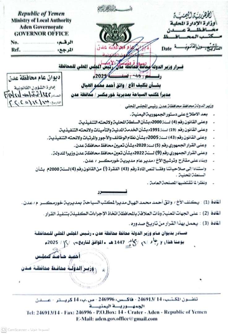 أصدر وزير الدولة، محافظ العاصمة عدن، الأستاذ أحمد حامد لملس، قرارًا قضى بتعيين الأستاذ واثق الهيال مديرًا لمكتب السياحة في مديرية خورمكسر، في إطار جهود السلطة المحلية لتعزيز الأداء المؤسسي وتفعيل الدور السياحي في المديرية.
