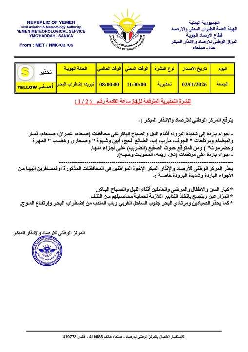 وتوقّع المركز أجواءً باردة إلى شديدة البرودة ليلًا وخلال ساعات الصباح الباكر على محافظات صعدة، عمران، صنعاء، ذمار، البيضاء، ومرتفعات الجوف ومأرب وإب والضالع ولحج وأبين وشبوة، إضافة إلى صحارى وهضاب المهرة وحضرموت، مع احتمال تشكّل الصقيع (الضريب) في أجزاء منها. كما يُتوقع طقس بارد على مرتفعات تعز وريمة والمحويت وحجة.