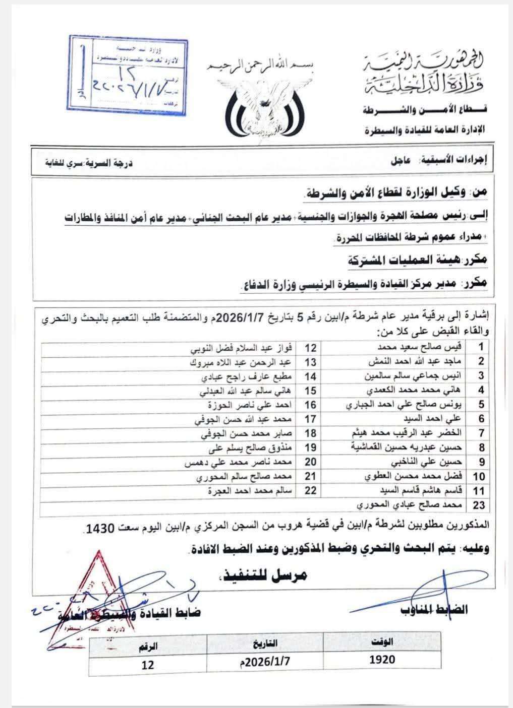 التوجيهات الرسمية: وجه وكيل وزارة الداخلية لقطاع الأمن والشرطة برقية "عاجلة وسرية للغاية" إلى كل من: مصلحة الهجرة والجوازات، ومدير عام البحث الجنائي، ومديري أمن المنافذ والمطارات، ومدراء شرطة المحافظات المحررة، لرفع الجاهزية وضبط الفارين.