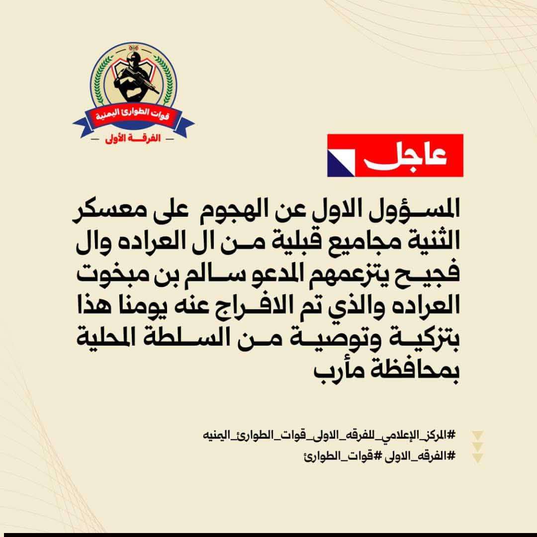 وقال المركز الإعلامي للفرقة الأولى – قوات الطوارئ اليمنية، إن المسؤول الأول عن الهجوم هو مجاميع قبلية من آل العرادة وآل فجيح، ويتزعمها المدعو سالم بن مبخوت العرادة، مشيراً إلى أنه تم الإفراج عنه اليوم بتزكية وتوصية من السلطة المحلية بمحافظة مأرب.
