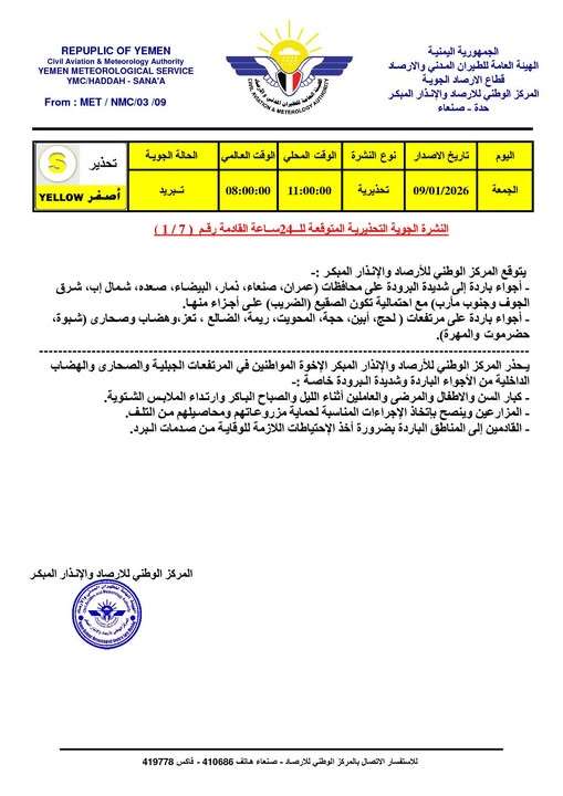 وأوضح المركز في نشرته التحذيرية الصادرة اليوم الجمعة 9 يناير 2026، أن الطقس سيكون باردًا إلى شديد البرودة على محافظات عمران، صنعاء، ذمار، البيضاء، صعدة، شمال إب، شرق الجوف وجنوب مأرب، مع احتمالية تشكّل الصقيع (الضريب) في أجزاء منها.