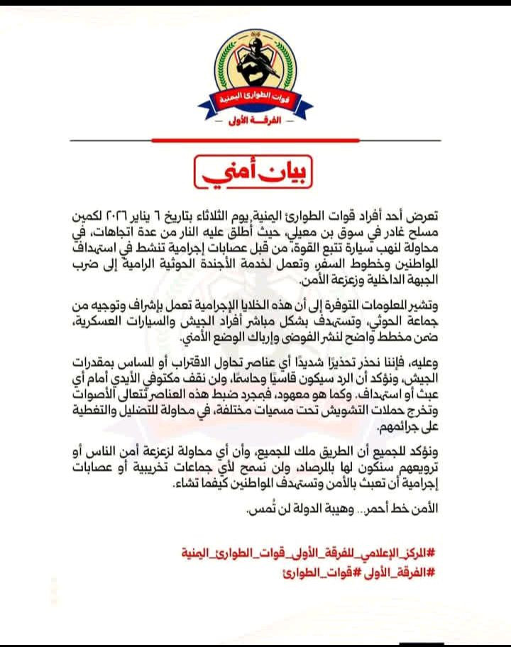 اصدرت قوات الطوارئ اليمنية بيان أمني كشفت فيه عن تعرض أحد أفراد قواتها لكمين مسلح