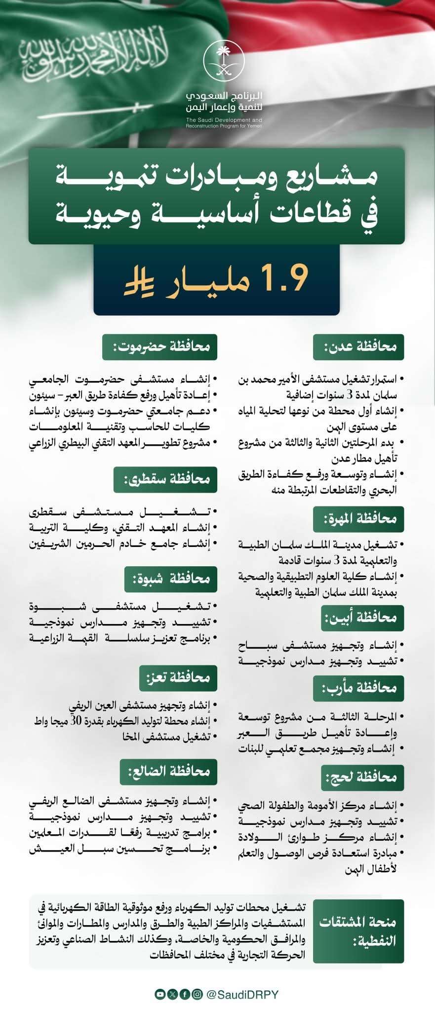 وأوضح أن هذه المشاريع تأتي امتدادًا لسلسلة من المشاريع الحيوية التي ينفذها البرنامج السعودي لتنمية وإعمار اليمن، ممثلًا بسعادة السفير محمد آل جابر، في إطار دعم التنمية المستدامة، وتحسين البنية التحتية والخدمات الأساسية في عدد من القطاعات الحيوية، وبما يحقق فوائد ملموسة لمحافظة المهرة وأبنائها.