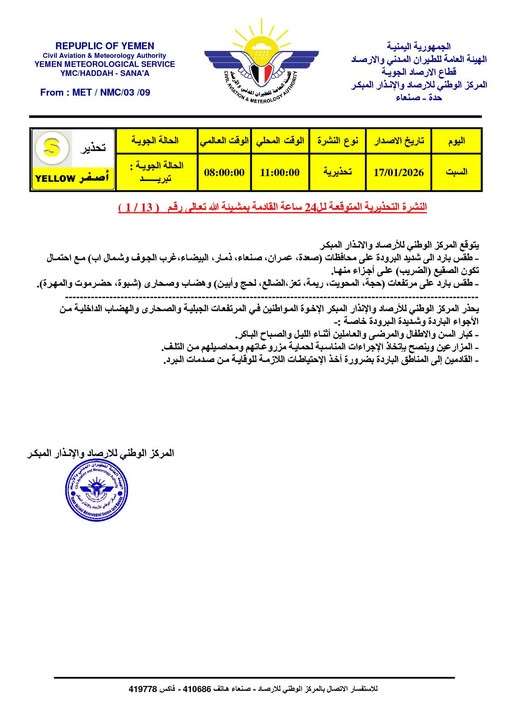 أصدر المركز الوطني للأرصاد والإنذار المبكر اليوم السبت نشرة تحذيرية رقم (13 / 1) تتوقع موجة تبريد حادة تجتاح معظم المحافظات اليمنية خلال الـ 24 ساعة القادمة مع احتمال تكون الصقيع الضريب في المرتفعات الجبلية