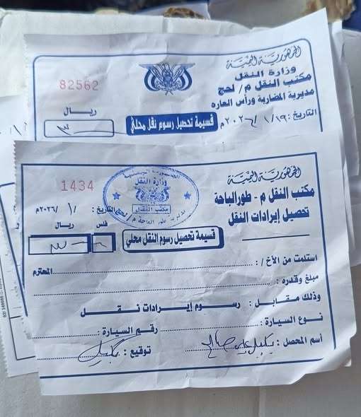 وتُبين السندات الميدانية (قسائم تحصيل رسوم نقل محلي) الصادرة بتاريخ اليوم الاثنين 19 يناير 2026، قيام مكاتب النقل في كل من مديرية طور الباحة ومديرية المضاربة ورأس العارة بتحصيل مبالغ إيرادية من المركبات المارة في هذه المناطق.