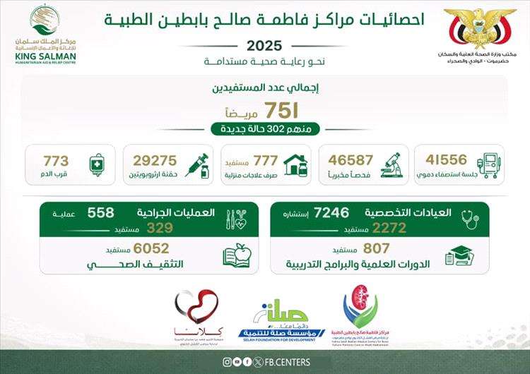 وتؤكد هذه الأرقام حجم الجهود الكبيرة والدور الإنساني والطبي الذي تقوم به مراكز فاطمة صالح بابطين الطبية بوادي حضرموت خلال عام 2025م، بدعم من مركز الملك سلمان للإغاثة والأعمال الإنسانية، وبشراكة فاعلة مع جمعية كلانا الخيرية ومؤسسة صلة للتنمية، في سبيل تخفيف معاناة مرضى الفشل الكلوي وتعزيز جودة الرعاية الصحية المقدمة لهم.