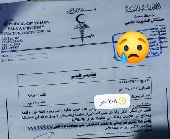 كشفت مصادر محلية في العاصمة صنعاء عن قيام إدارة مستشفى الكويت الجامعي (الحكومي) باحتجاز جثمان طفل رضيع ورفض تسليمه لوالده المكلوم، بحجة وجود مبالغ مالية متبقية كرسوم للعملية الجراحية والعناية المركزية.