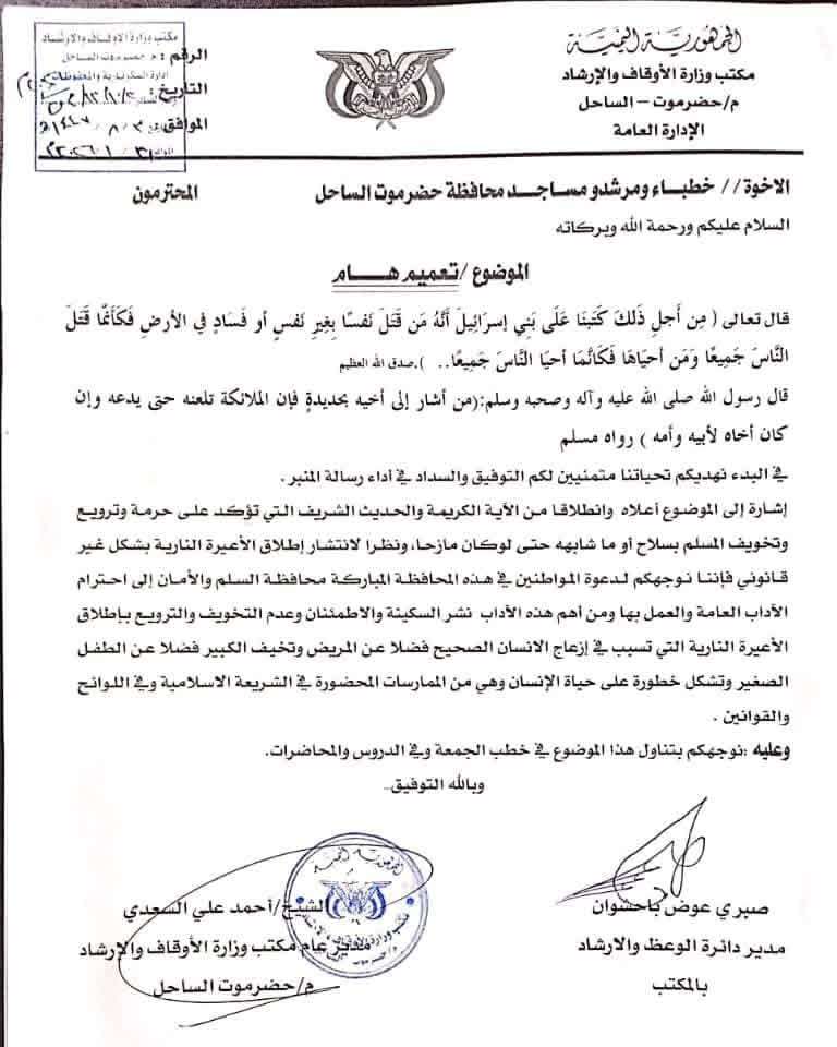 ووجه مدير عام مكتب الأوقاف، الشيخ أحمد علي السعدي، جميع خطباء الجوامع والدعاة والمرشدين بضرورة تخصيص جزء من خطب الجمعة والمحاضرات والدروس اليومية للتوعية بمخاطر إطلاق الأعيرة النارية بشكل غير قانوني. وأكد التعميم على أهمية استعادة الهدوء والوئام في مدينة المكلا المعروفة بسلميتها.
