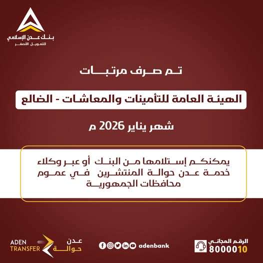 أعلنت الهيئة العامة للتأمينات والمعاشات بمحافظة الضالع، اليوم، عن بدء عملية صرف مرتبات المتقاعدين لشهر يناير 2026م.