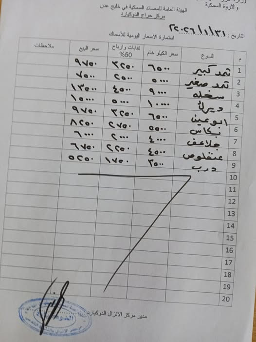 أعلنت الهيئة العامة للمصائد السمكية، صباح اليوم السبت، الأسعار الرسمية المعتمدة لبيع الأسماك في مركز حراج الدويكيارد بمديرية المعلا.