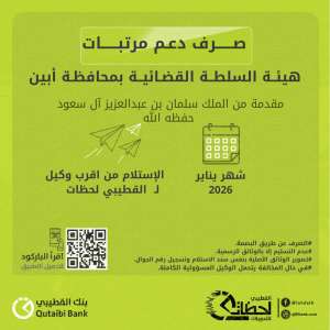 بنك القطيبي الإسلامي يعلن بدء صرف مرتبات منتسبي السلطة القضائية في عدد من المحافظات لشهر يناير 2026