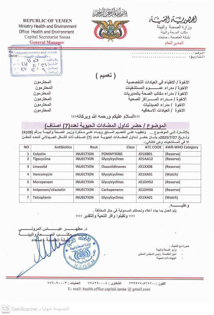أصدر مكتب الصحة والبيئة بأمانة العاصمة صنعاء تعميماً هاماً يقضي بضبط عملية تداول واستخدام مجموعة من المضادات الحيوية الحيوية، وحصر استهلاكها داخل المنشآت الطبية الكبرى (المستشفيات) فقط.