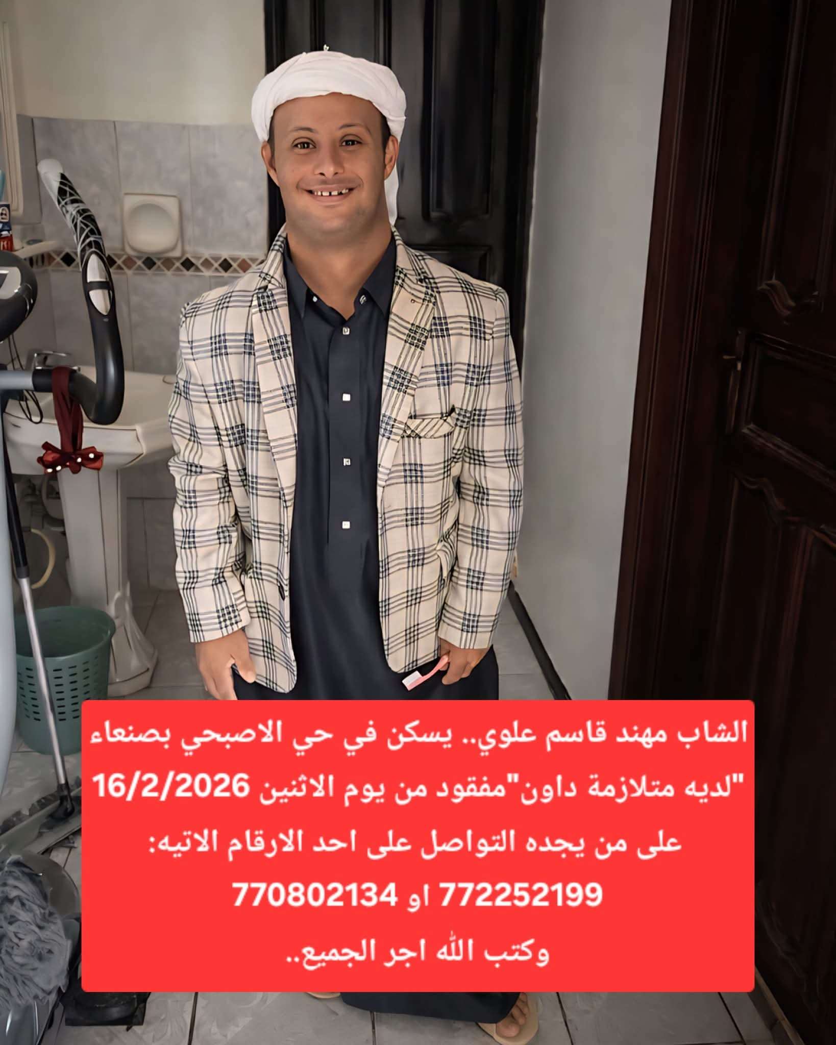 في حادثة مؤلمة تهز القلوب.. اختفاء شاب من ذوي متلازمة داون في صنعاء اثناء سفره لعدن
