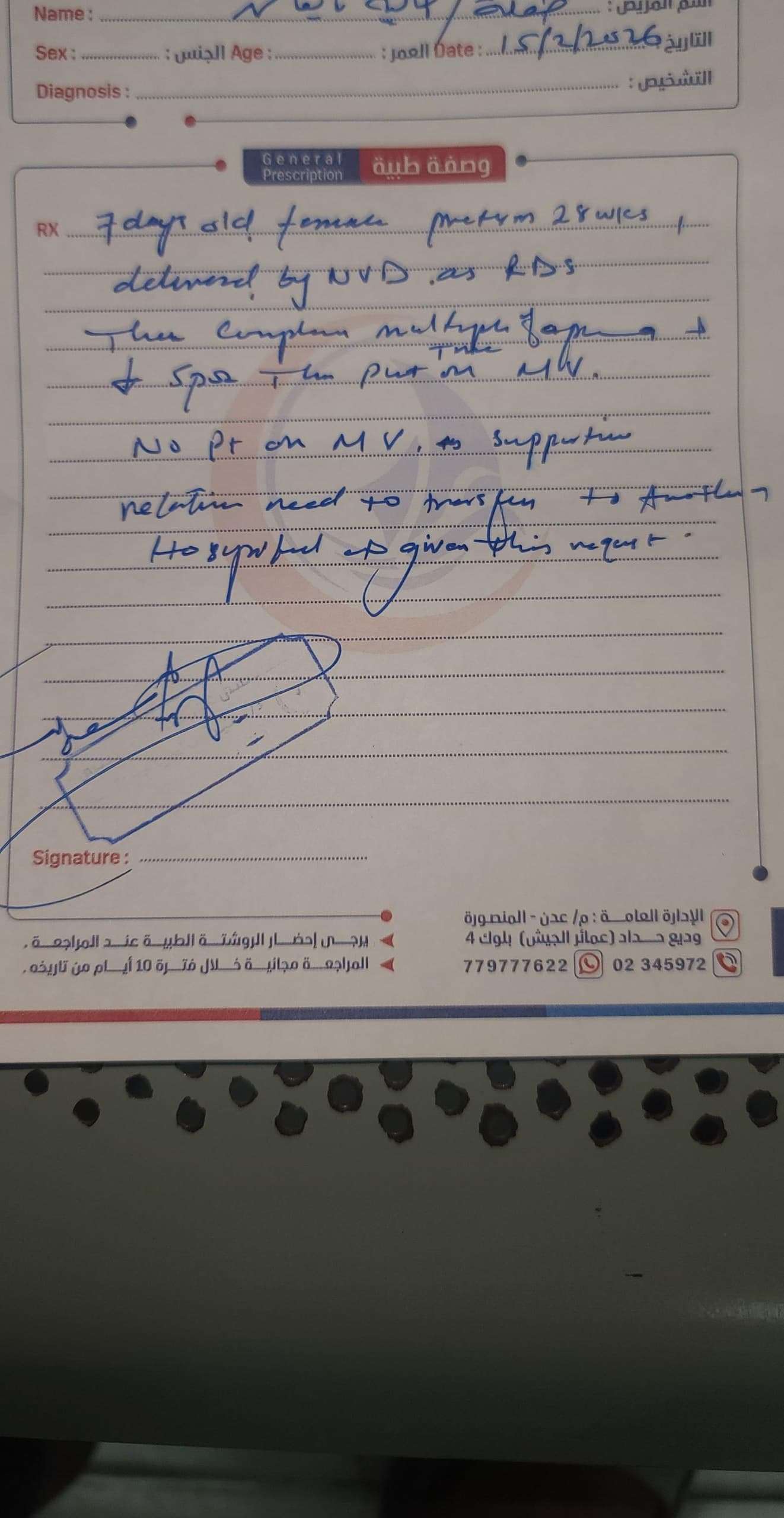 في مشهد إنساني مؤثر، تناشد أسرةٌ كريمة أهل الخير وأصحاب القلوب الرحيمة مدّ يد العون لإنقاذ طفلتهم الخدج (المولودة ولادة مبكرة)، والتي ترقد حاليًا في قسم العناية المركزة لحديثي الولادة، وسط ظروف صحية حرجة تتطلب رعاية طبية متخصصة وتكاليف علاجية باهظة تفوق قدرتهم المادية.
