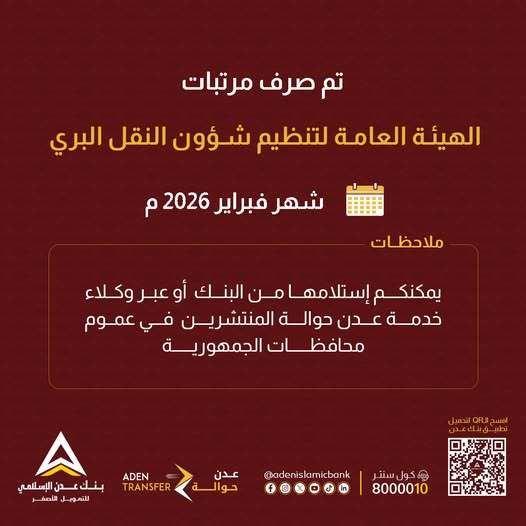 أعلنت الهيئة العامة لتنظيم شؤون النقل البري عن صرف مرتبات موظفيها لشهر فبراير 2026م. وأوضحت الهيئة أن الموظفين يمكنهم استلام مرتباتهم عبر شبكة البنك، بما يتيح لهم الحصول على مستحقاتهم بسهولة ويسر.