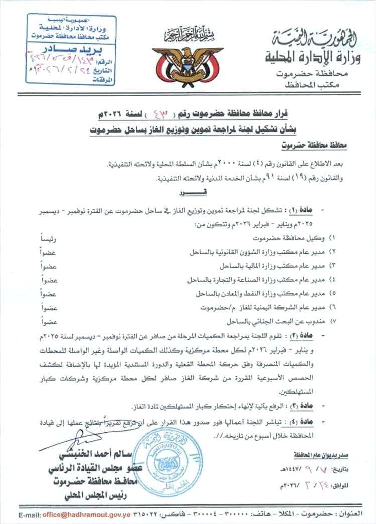 أصدر عضو مجلس القيادة الرئاسي محافظ حضرموت الاستاذ سالم احمد الخنبشي، اليوم، القرار رقم (43) لسنة 2026م بشأن تشكيل لجنة المراجعة تموين وتوزيع الغاز بساحل حضرموت، عقب الاطلاع على القانون رقم (4) لسنة 2000م بشأن السلطة المحلية ولائحته التنفيذية والقانون رقم (19) لسنة 91م بشأن الخدمة المدنية ولائحته التنفيذية، ونص القرار على التالي: