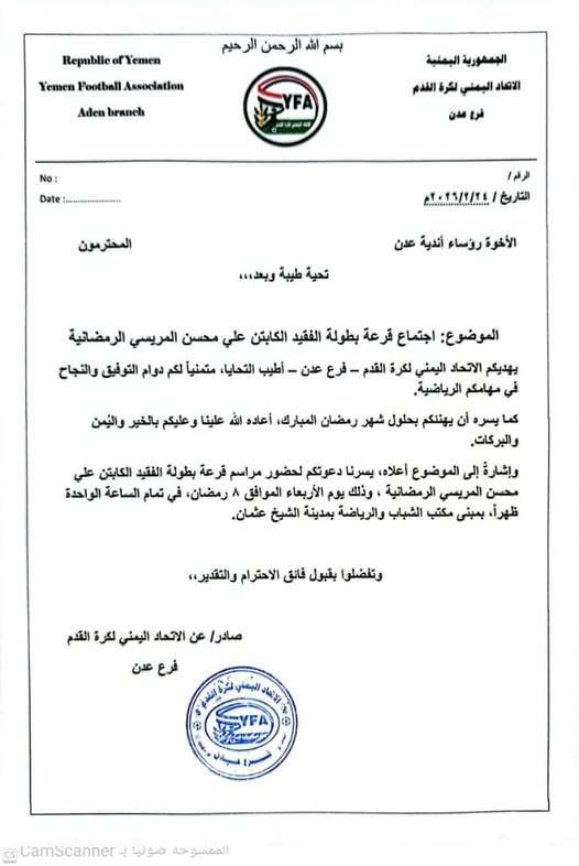 دعا اتحاد عدن لكرة القدم جميع رؤساء أندية عدن لحضور قرعة بطولة الفقيد علي محسن المريسي 30، والتي ستُعقد في مكتب الشباب والرياضة بمديرية الشيخ عثمان.