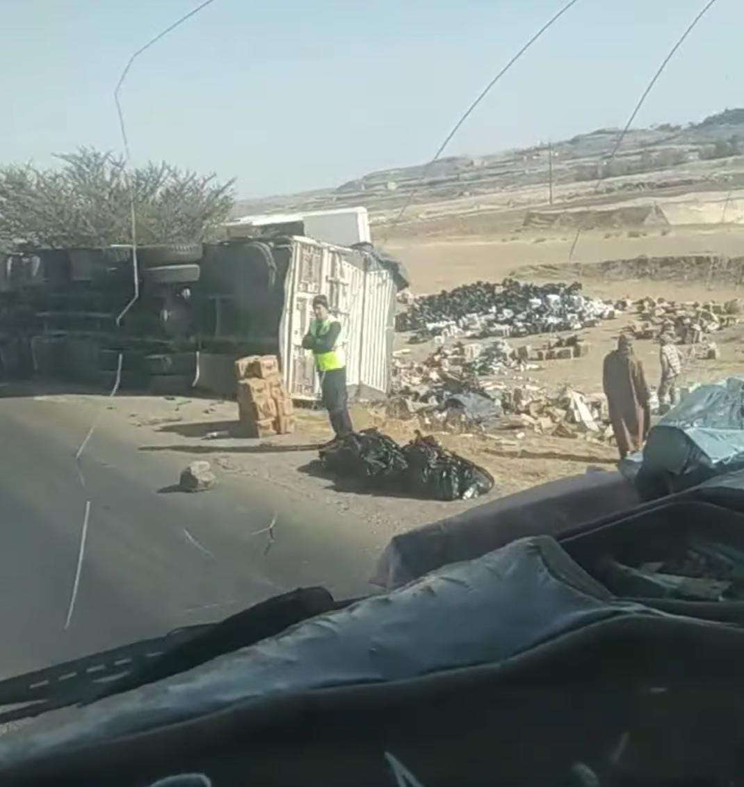 شهدت مديرية يريم بمحافظة إب صباح اليوم حادث انقلاب شاحنة كانت تحمل كمية من طلاء “كميكو”، ما أدى إلى تناثر جزء من الحمولة في موقع الحادث.