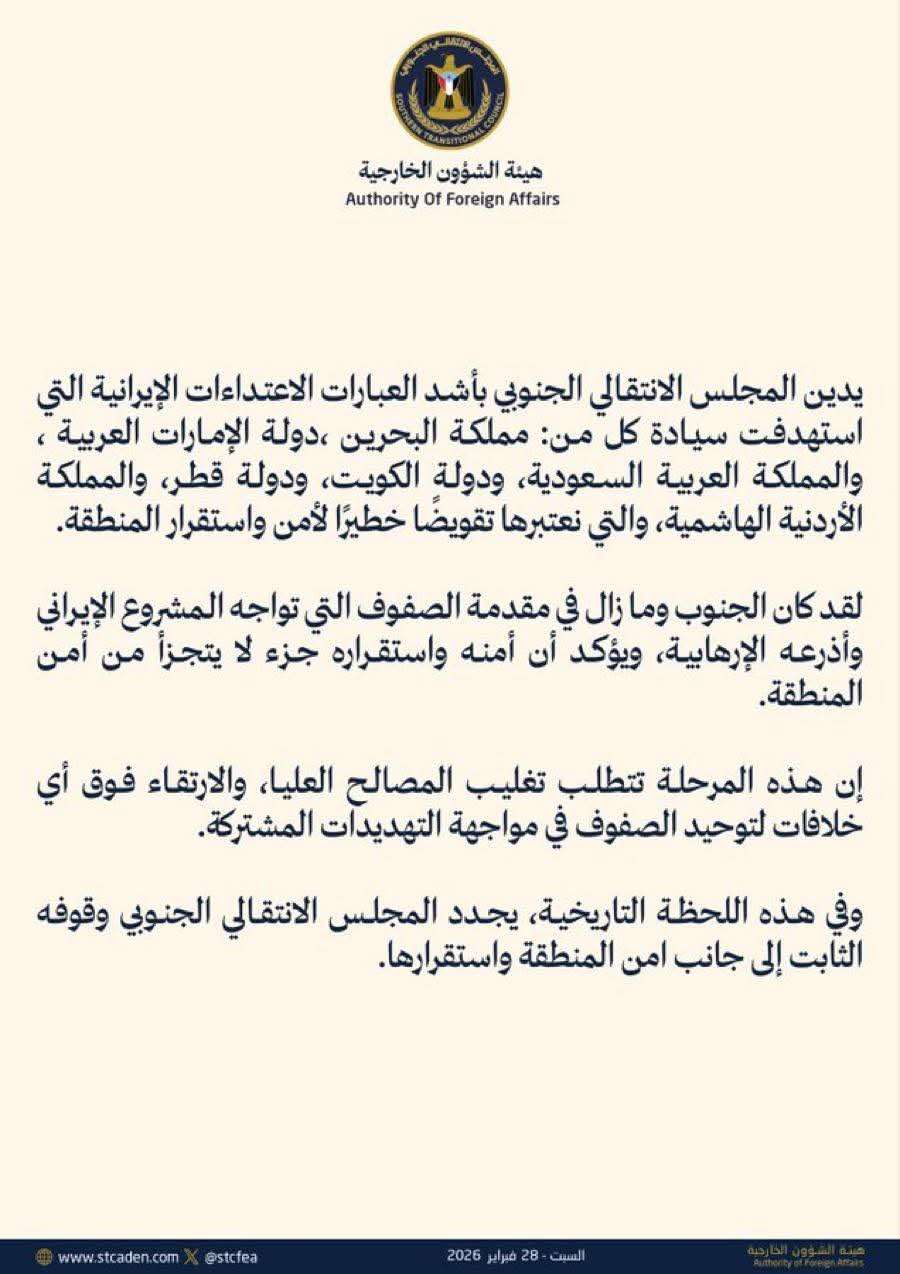 أصدرت هيئة الشؤون الخارجية للمجلس الانتقالي الجنوبي بياناً سياسياً هاماً، أدانت فيه بأشد العبارات الاعتداءات الإيرانية التي استهدفت سيادة عدد من الدول العربية الشقيقة.
