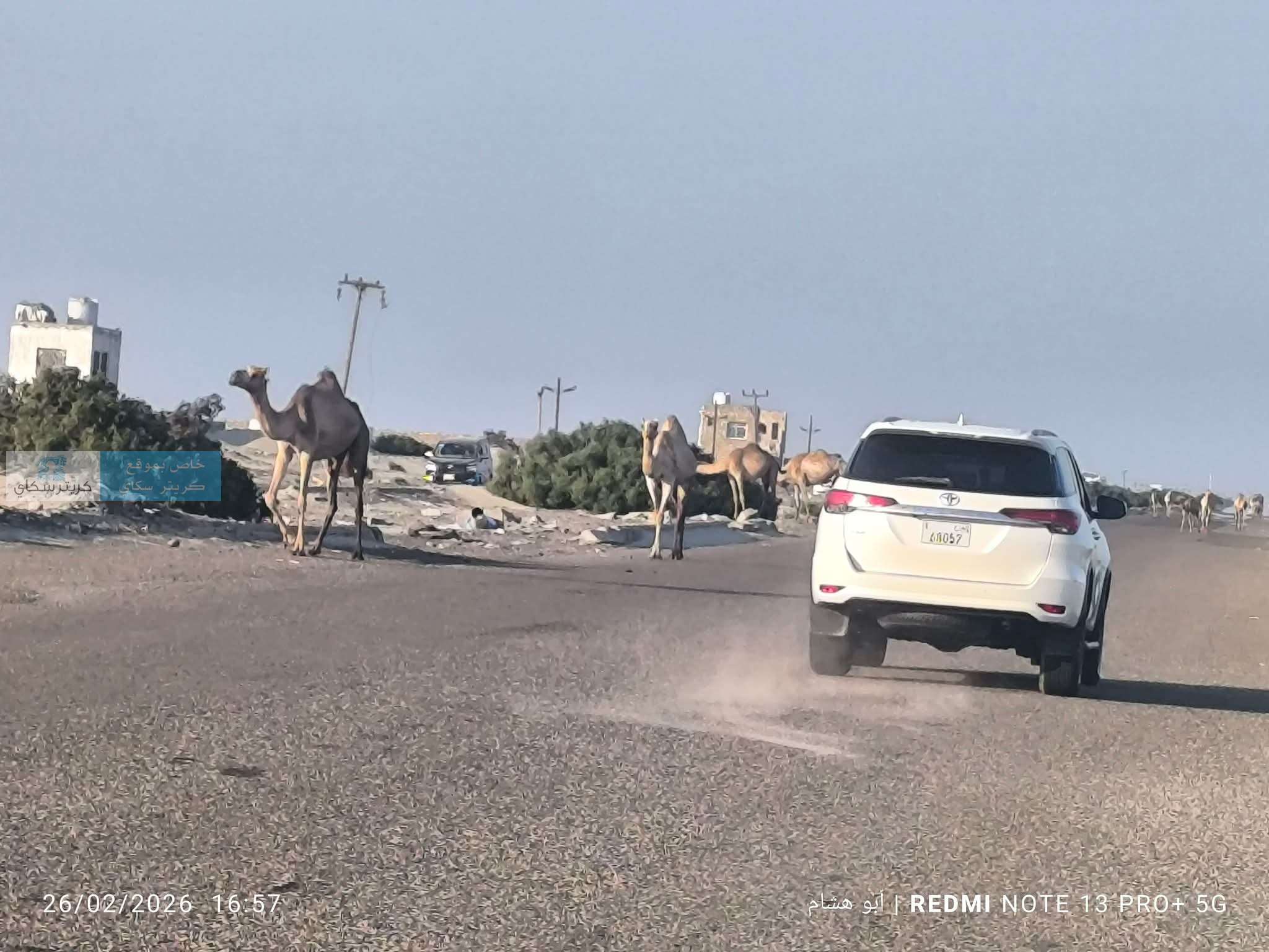 ​تظهر الصور الملتقطة قطعان من الإبل وهي تقترب من المسار السريع للسيارات، وهو ما يشكل عائقاً مفاجئاً أمام حركة السير. وتكمن الخطورة في:
