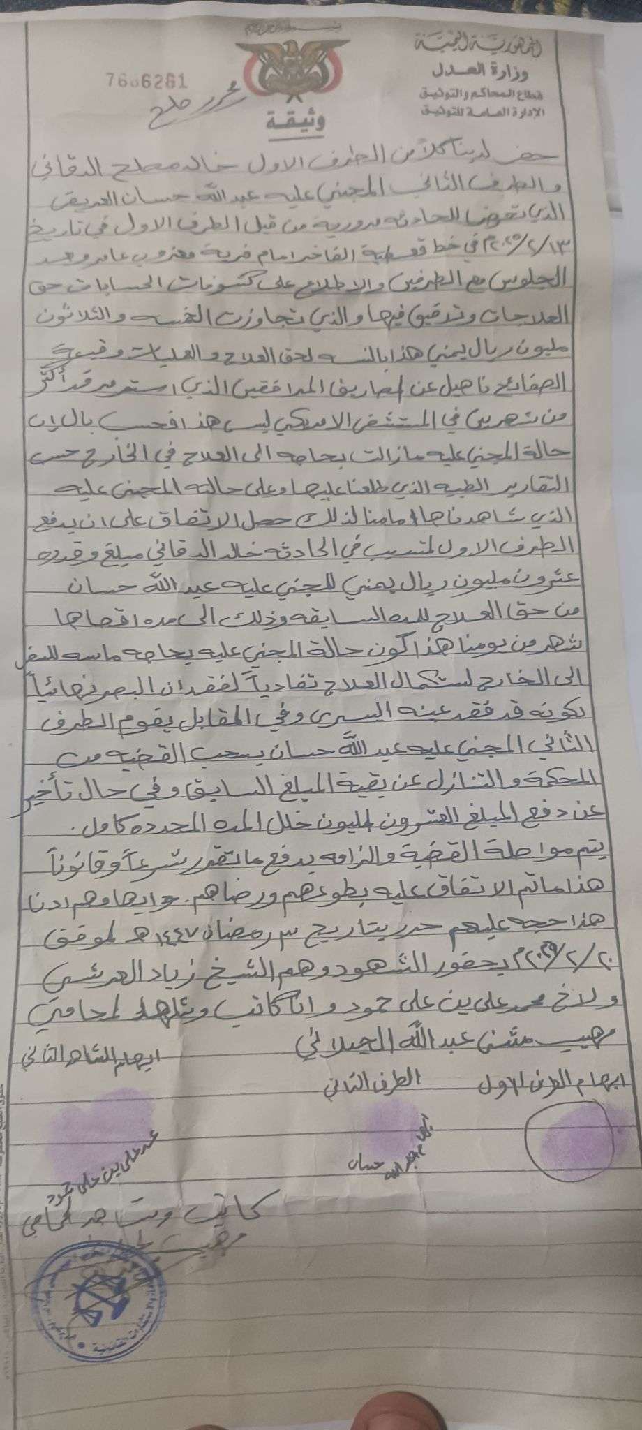 وكان الحادث المروري المروع قد أسفر عن وفاة شخص وإصابة آخر إصابات بليغة استدعت دخوله العناية المركزة لفترة طويلة، مما تسبب في تراكم تكاليف طبية باهظة. وعقب الإجراءات القانونية والعرفية، حُكم على السائق بدفع مبلغ 20 مليون ريال يمني تشمل الدية الشرعية ومصاريف العلاج للمصاب.