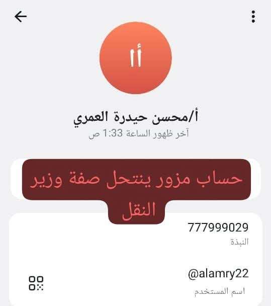 أصدر وزير النقل محسن حيدرة العمري تنويهاً مهماً حذر فيه من وجود حسابات وهمية تنتحل اسمه وصفته على منصات التواصل الاجتماعي.