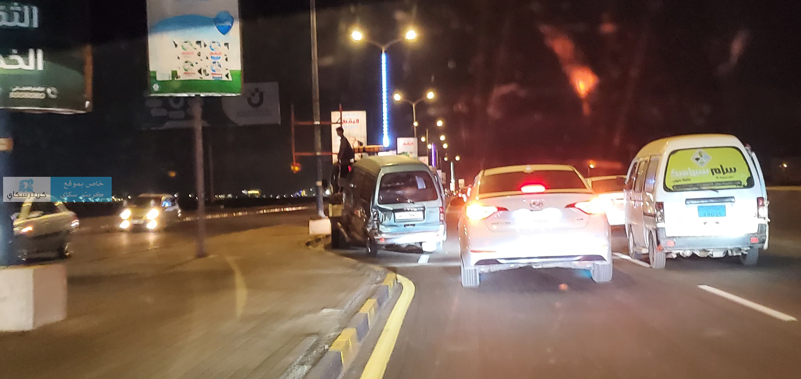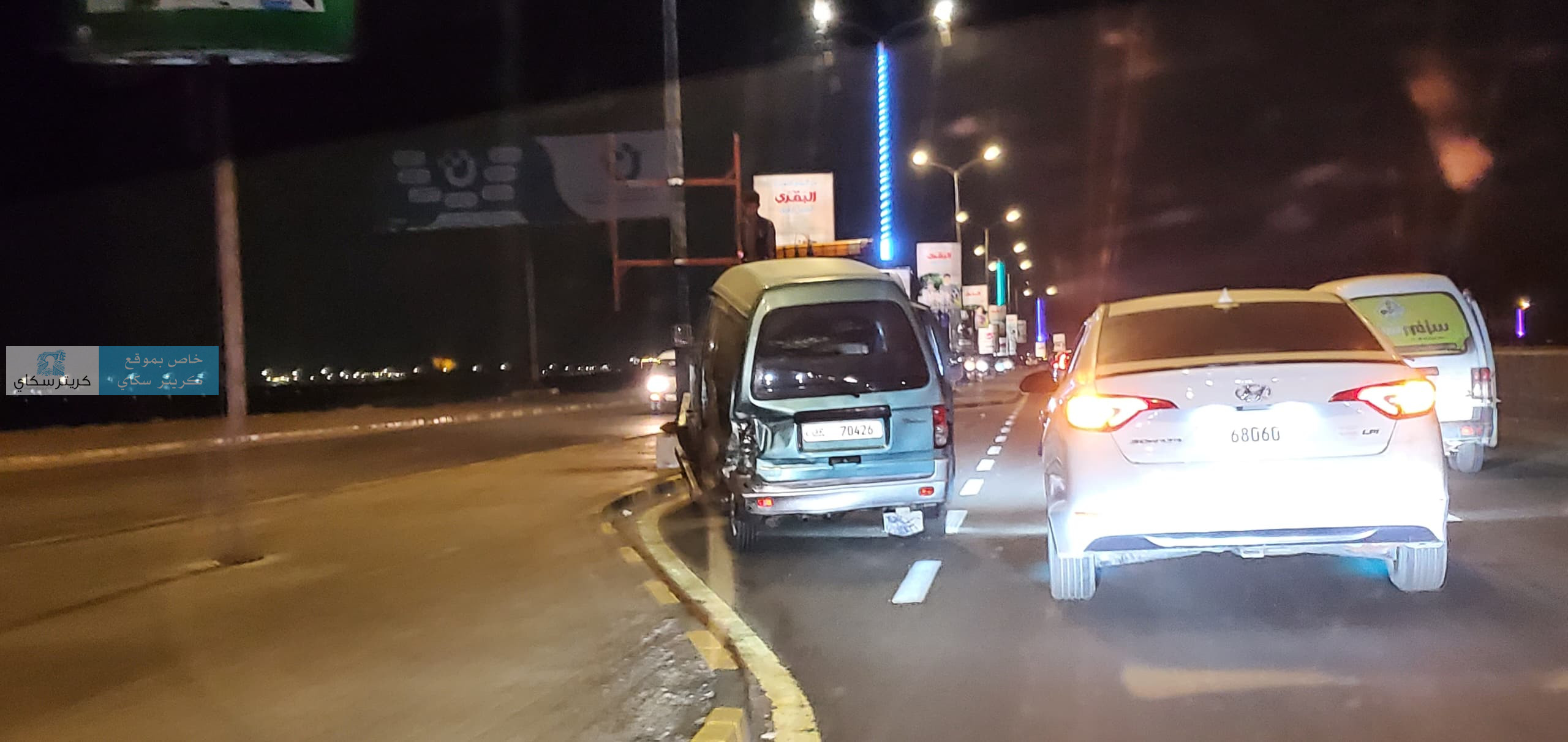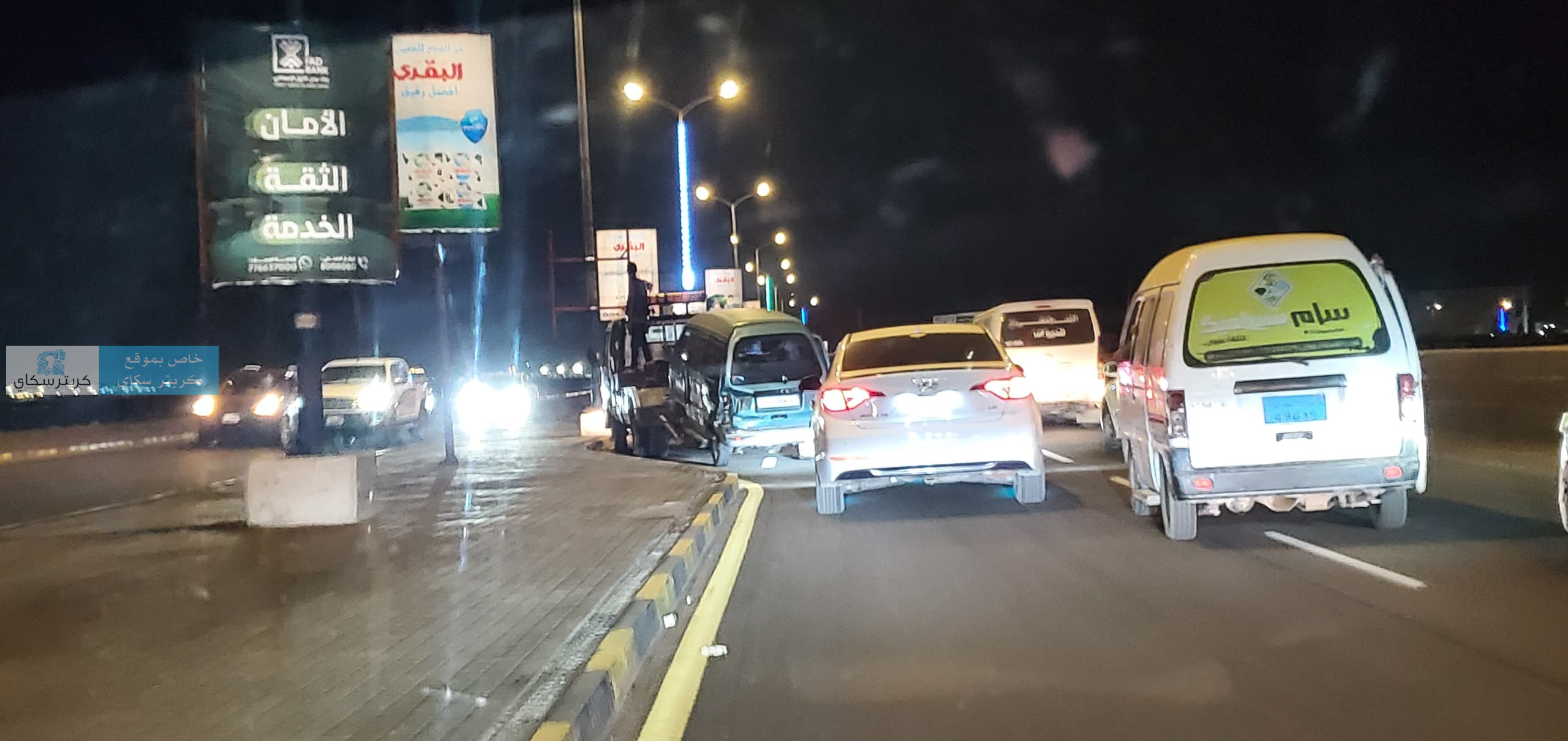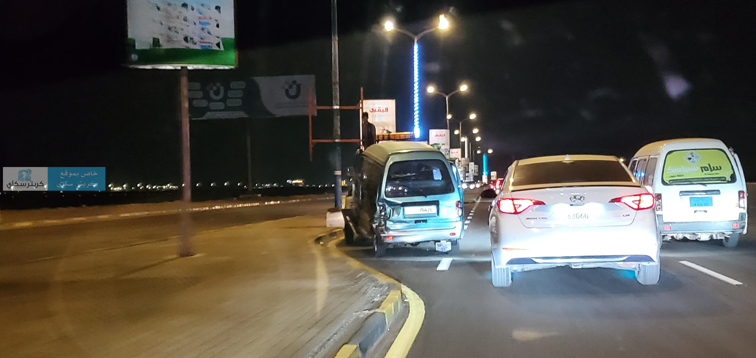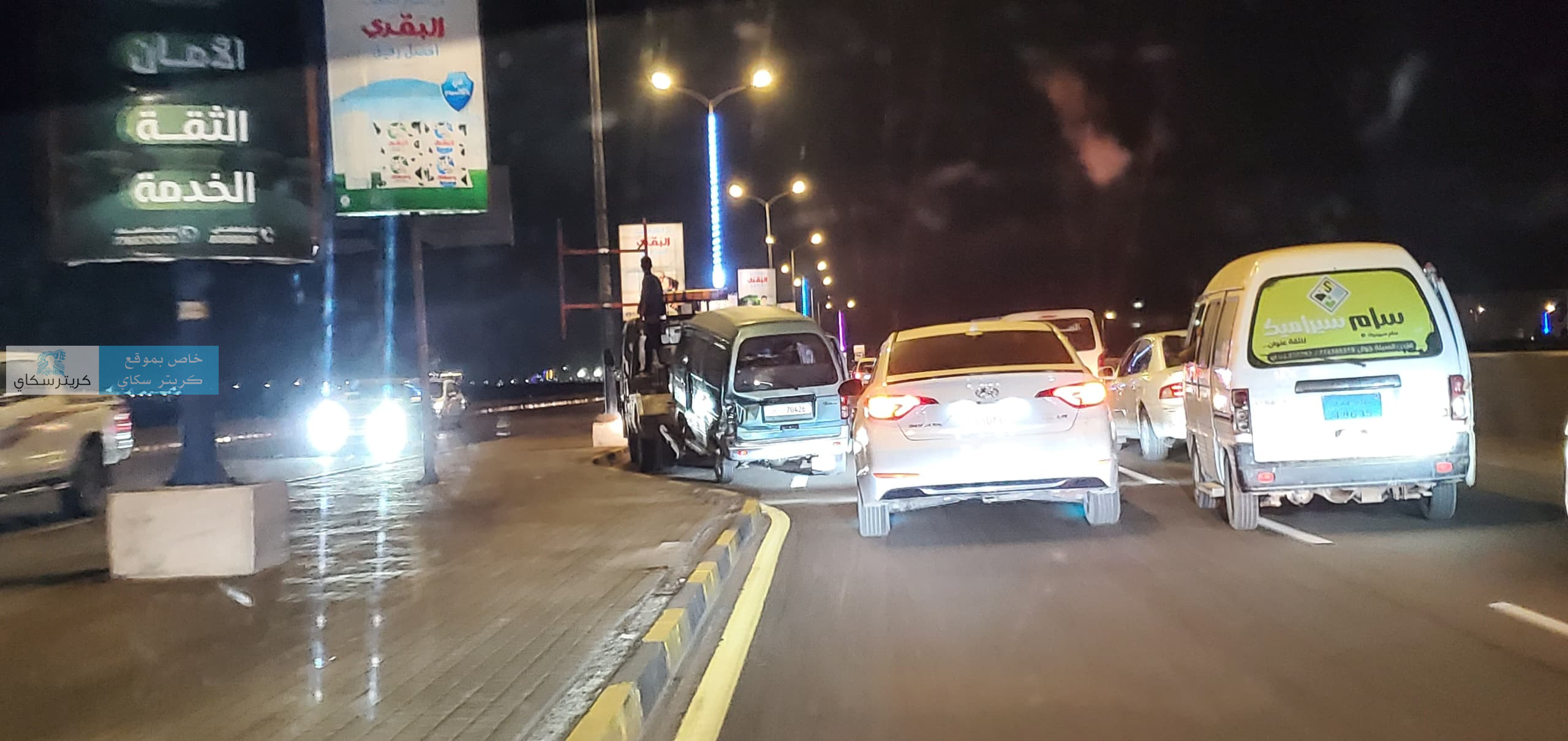 وتعرض باص دباب لحادث مروري بالطريق البحري قبل ان يتم سحبه بالونش