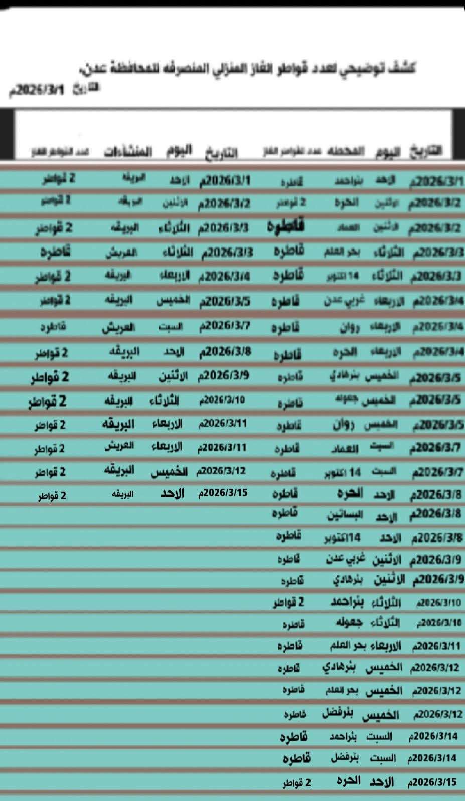 وبحسب الكشوفات المعتمدة منذ 1 فبراير 2026، يبلغ عدد المحطات المركزية 13 محطة موزعة في عدة مناطق بعدن، وقد بلغ إجمالي قواطر الغاز المخصصة لها 52 قاطرة لتغطية احتياجات المواطنين من الغاز المنزلي.