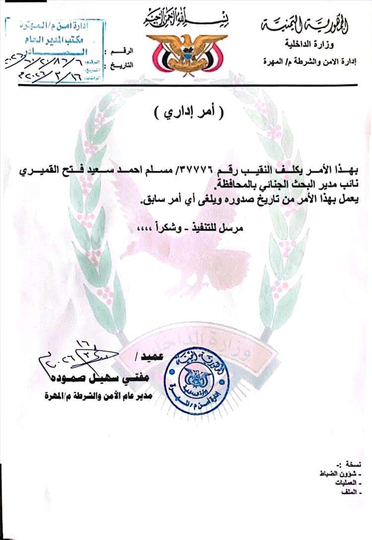 أصدر مدير عام الأمن والشرطة بمحافظة المهرة، العميد مفتي سهيل صموده، أمراً إدارياً قضى بتكليف النقيب مسلم أحمد سعيد فتح القميري نائباً لمدير البحث الجنائي بالمحافظة.
