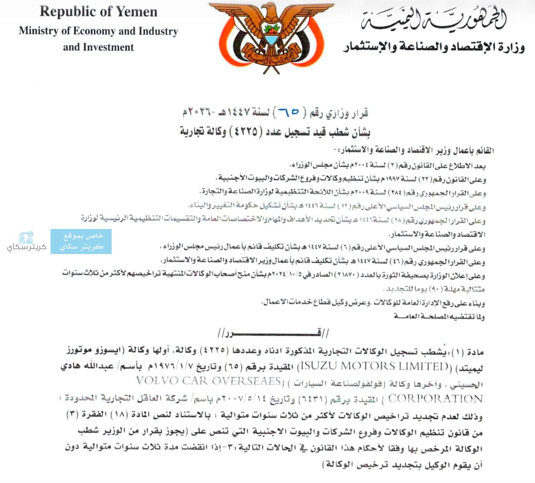 في خطوة تصعيدية جديدة ضد القطاع الخاص، أصدرت جماعة الحوثي عبر ما يسمى بـ "وزارة الاقتصاد والصناعة والاستثمار" في صنعاء، قراراً يقضي بشطب 4225 وكالة تجارية دفعة واحدة، في إجراء وصفه مراقبون بـ "المجزرة الاقتصادية" التي تستهدف بنية التجارة في اليمن.