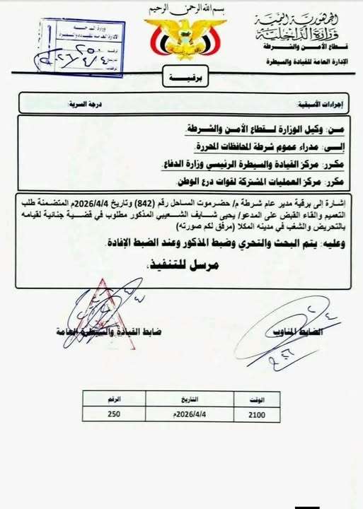أصدر اللواء الركن محمد مساعد الأمير، وكيل وزارة الداخلية لقطاع الأمن والشرطة، تعميمًا موجّهًا إلى مدراء عموم شرطة المحافظات المحررة وقوات درع الوطن، يقضي بالقبض على الدكتور يحيى شائف الشعيبي على خلفية الأحداث الأخيرة في محافظة حضرموت.