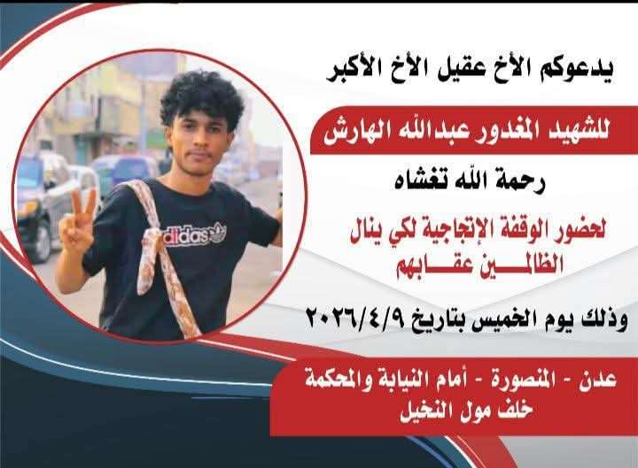 وجه أولياء دم المواطن عبدالله سعيد الهارش الكازمي دعوة عامة للمشاركة في وقفة احتجاجية، للمطالبة بالقصاص ومحاسبة المتورطين في جريمة مقتله التي وصفوها بالغادرة.