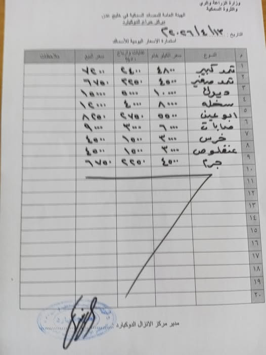 أصدرت الهيئة العامة للمصايد السمكية، عبر مركز حراج الدوكيارد في خليج عدن، قائمة أسعار الأسماك لليوم الأثنين، والتي جاءت على النحو التالي: