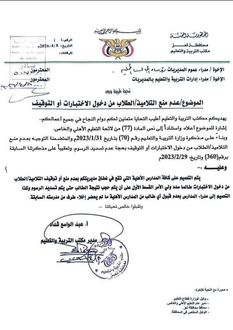 وجّه مكتب التربية والتعليم بتعز المدارس الأهلية بعدم حرمان الطلاب من دخول الاختبارات بسبب عدم سداد الرسوم الدراسية، مؤكدًا أن ذلك يخالف توجيهات وزارة التربية والتعليم.