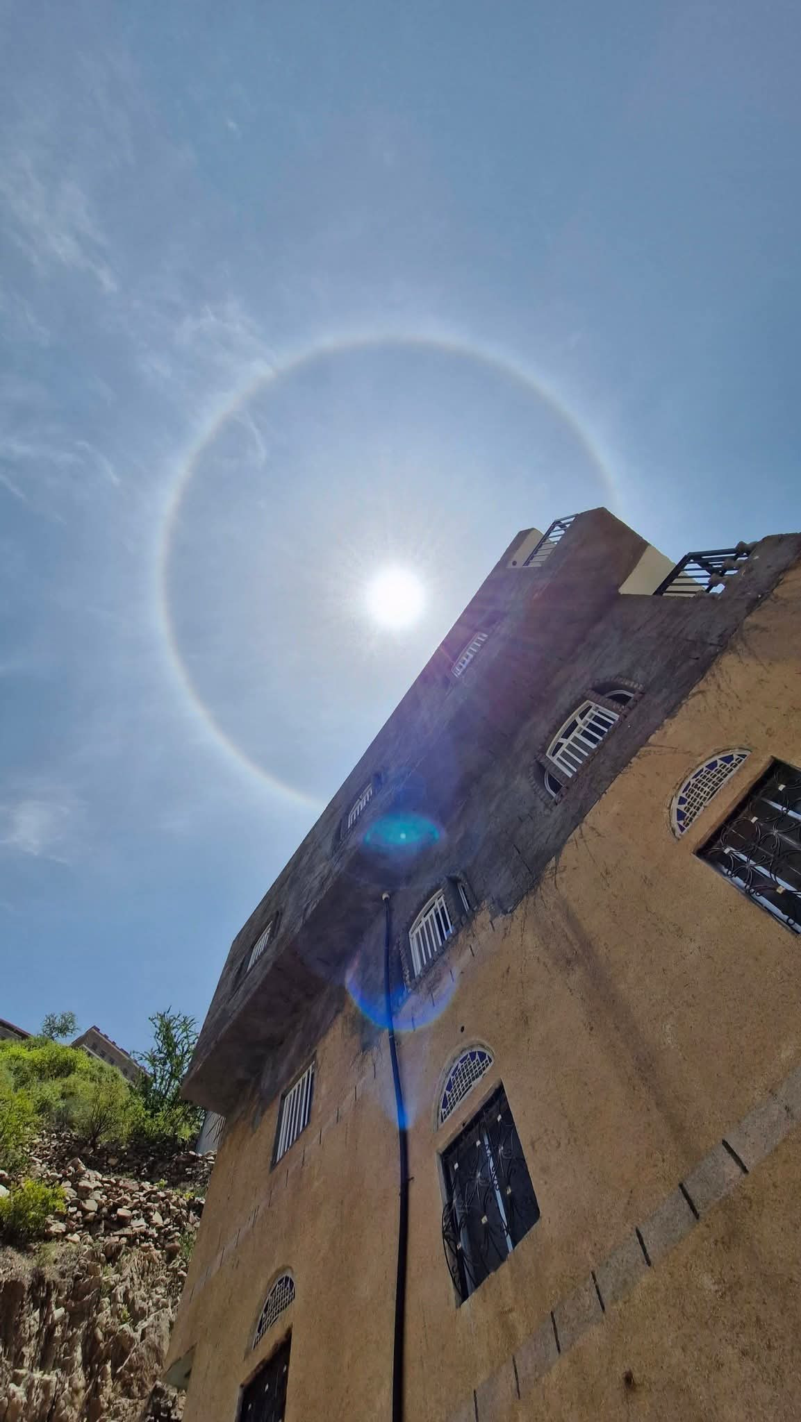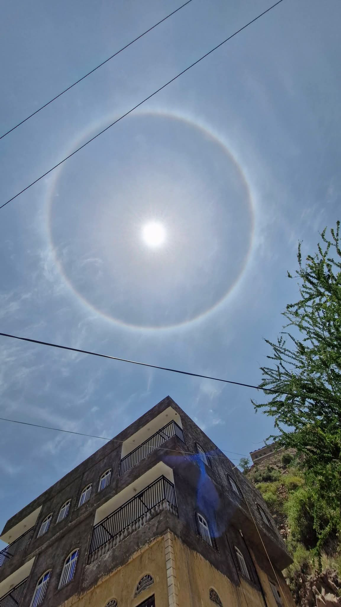 شهدت سماء منطقة القود لعصار في يافع، ظهر اليوم، ظاهرة جوية لافتة تمثلت في ظهور هالة دائرية تحيط بالشمس، ما أثار دهشة وإعجاب المواطنين.
