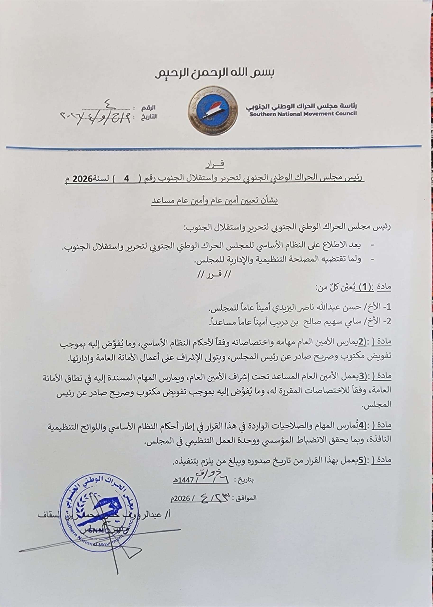 أصدر رئيس مجلس الحراك الوطني الجنوبي لتحرير واستقلال الجنوب، عبدالرؤوف زين السقاف، القرار رقم (4) لسنة 2026م، بشأن تعيين أمين عام وأمين عام مساعد للمجلس، في إطار تعزيز البناء التنظيمي وتطوير الأداء الإداري.