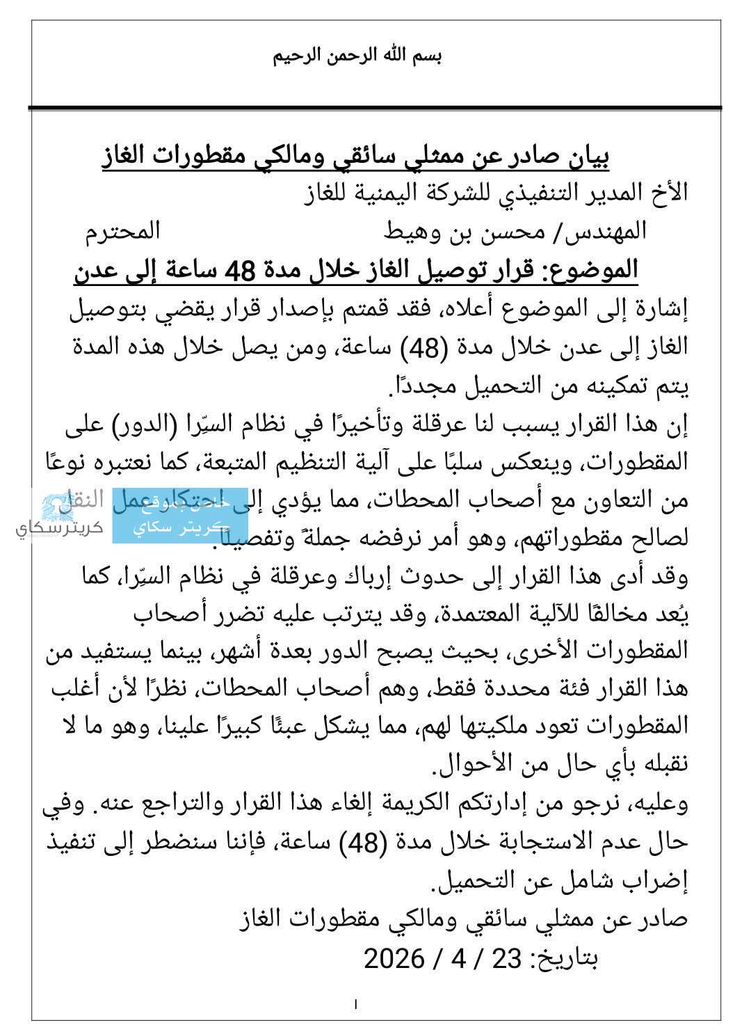 وبحسب مصادر إعلامية، فقد صدرت توجيهات تدعو سائقي الشاحنات وناقلات الوقود إلى التوقف عن شحن المشتقات النفطية من شركة النفط والجهات الحكومية، مع التلويح بتحميل أي جهة تخالف تلك التعليمات مسؤولية ما قد تتعرض له من أضرار، في خطوة اعتبرها مراقبون تجاوزاً واضحاً للقانون وتقويضاً لسلطة الدولة.